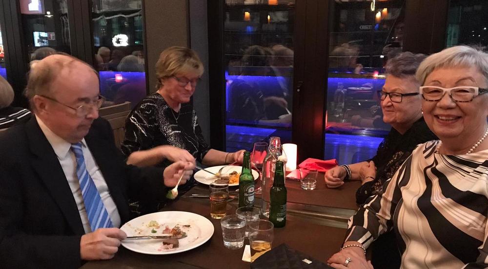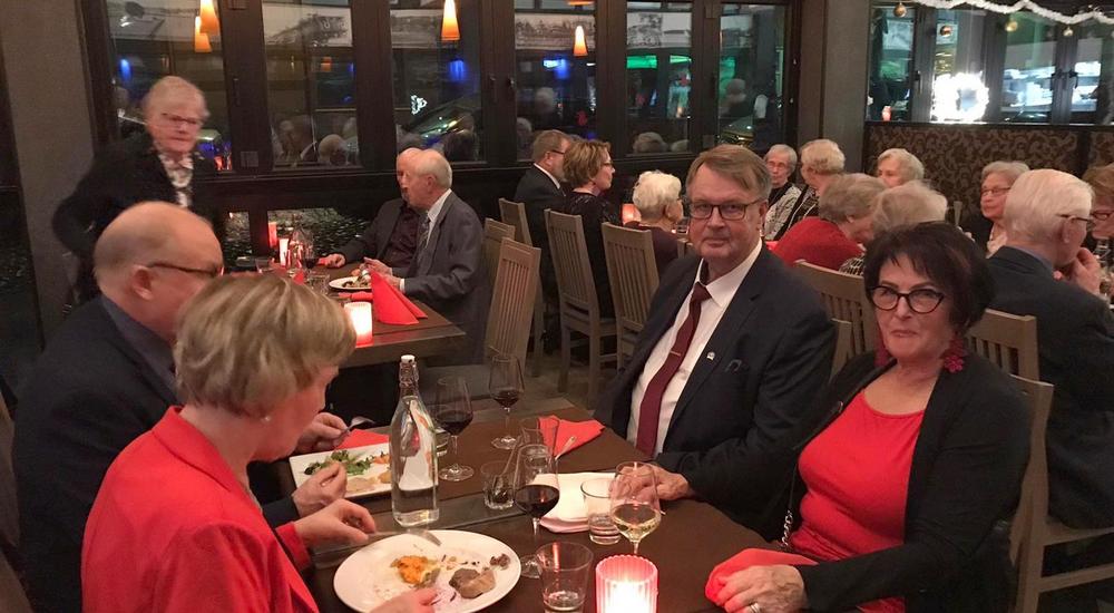 Seniorit viettivät pikkujoulua 7.12. Ravintola Waahdossa ruokaillen ja siitä siirtyen jatkamaan iltaa Kulttuuri-kellariin. Siellä kuuntelimme Olavi Virran iki-ihania lauluja, joita esitti Jari Pylväinen säestäjänään Mika Siekkinen. ”Hopeinen kuu luo merelle siltaa…”