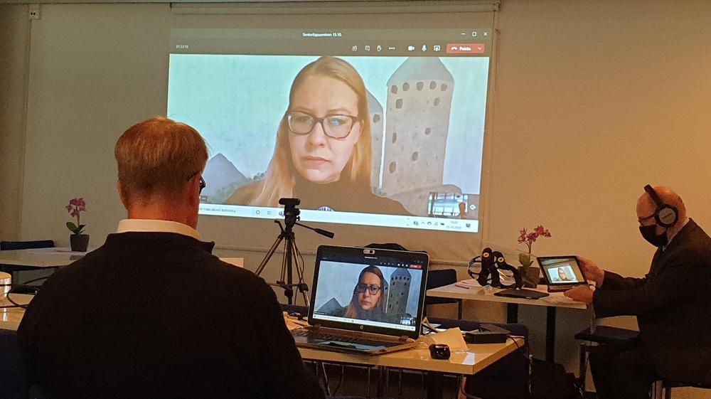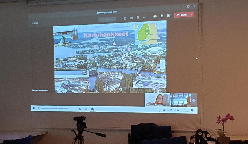 Kaupunginvaltuuston puheenjohtaja Anna-Kristiina Mikkonen oli senioritilaisuudessamme Teamsin-kautta. EKA KERTAA tilaisuus lähetettiin jäsenille suorana lähetyksenä, Youtuben kautta, katsottavaksi kotisohvalta. Alla muutama kuva tilaisuudesta. Risto viritteli melkoisen määrän johtoja, jotta kuva ja ääni kulkisivat yhtä aikaa. Ja kyllähän ne kulkivatkin. Kotona tilaisuutta seurasi 20 jäsentä. Anna-Kristiina kertoi Savonlinnan kärkihankkeista ja tietysti puhuttiin myös SOTEsta. Kiitos Anna-Kristiina!