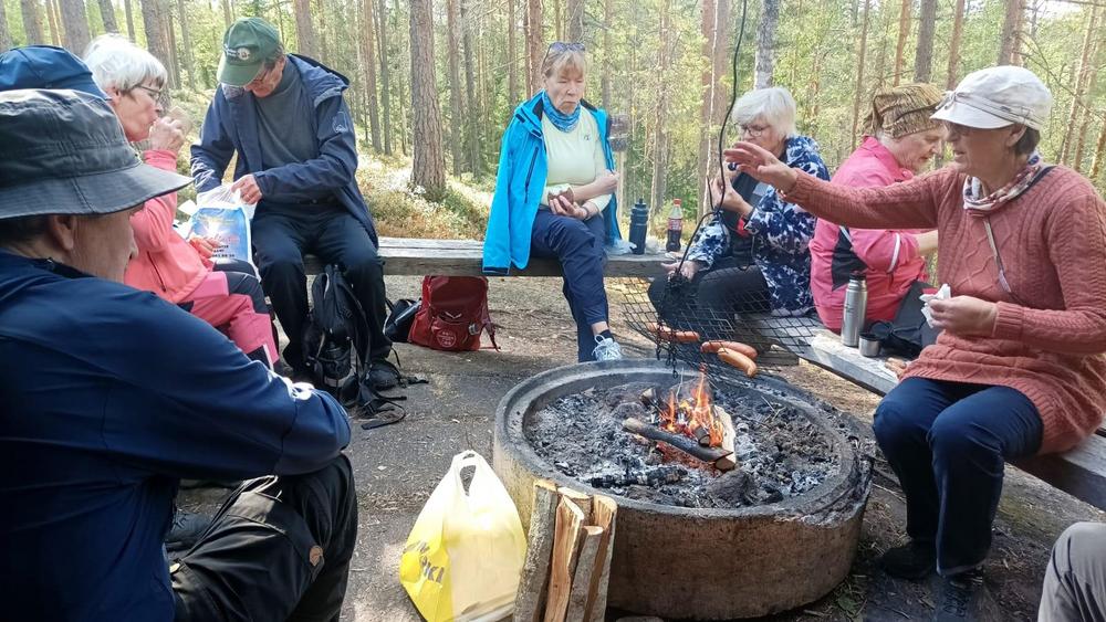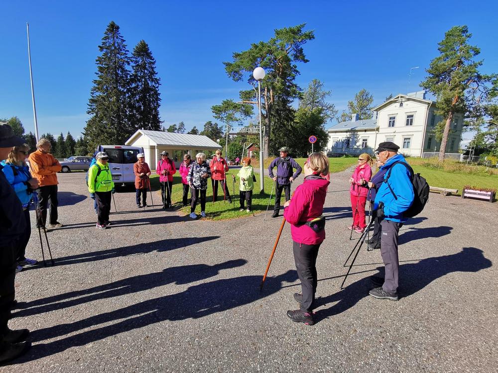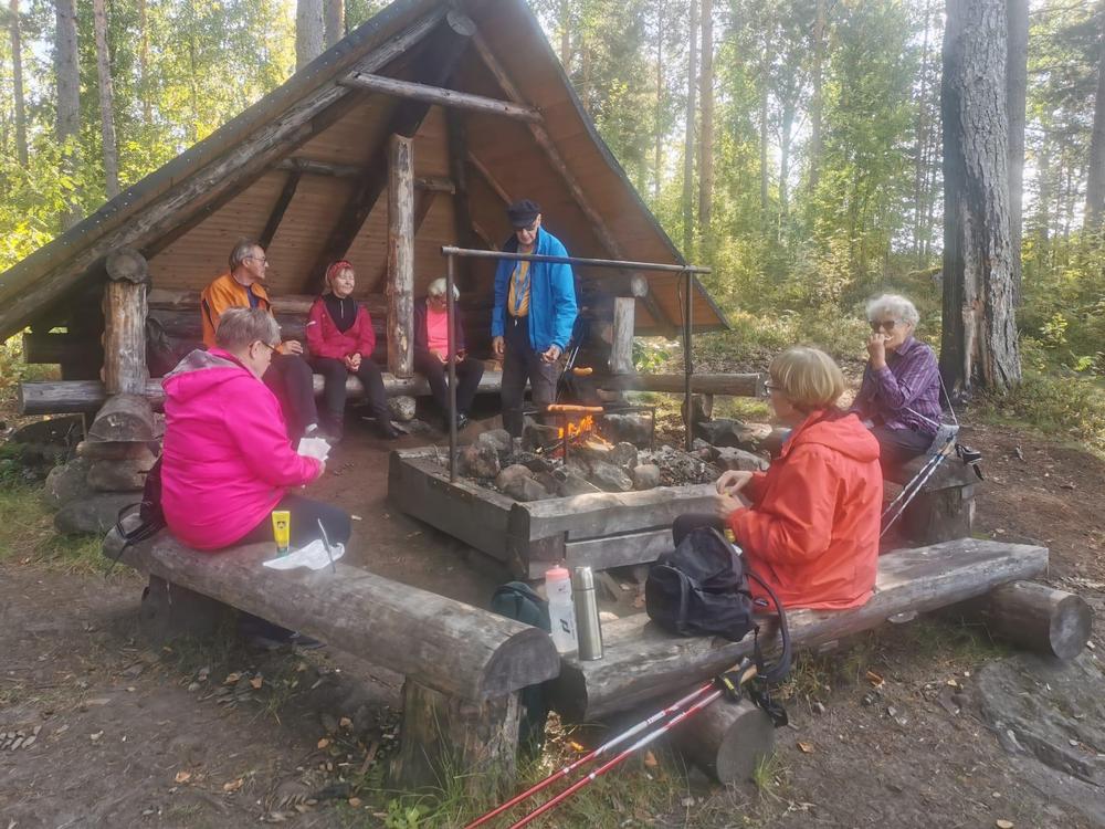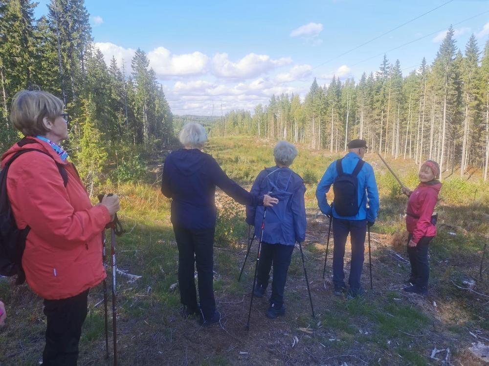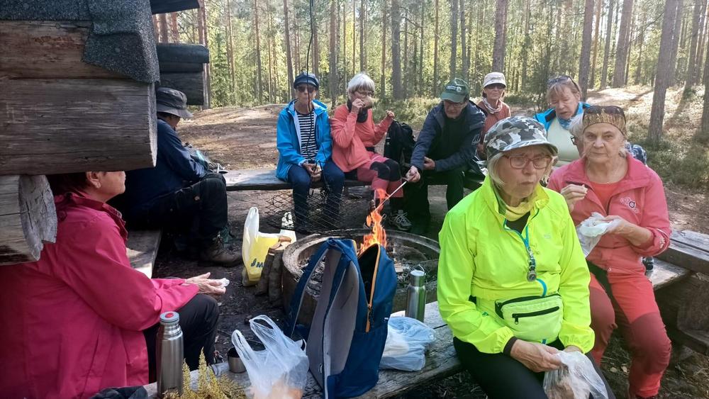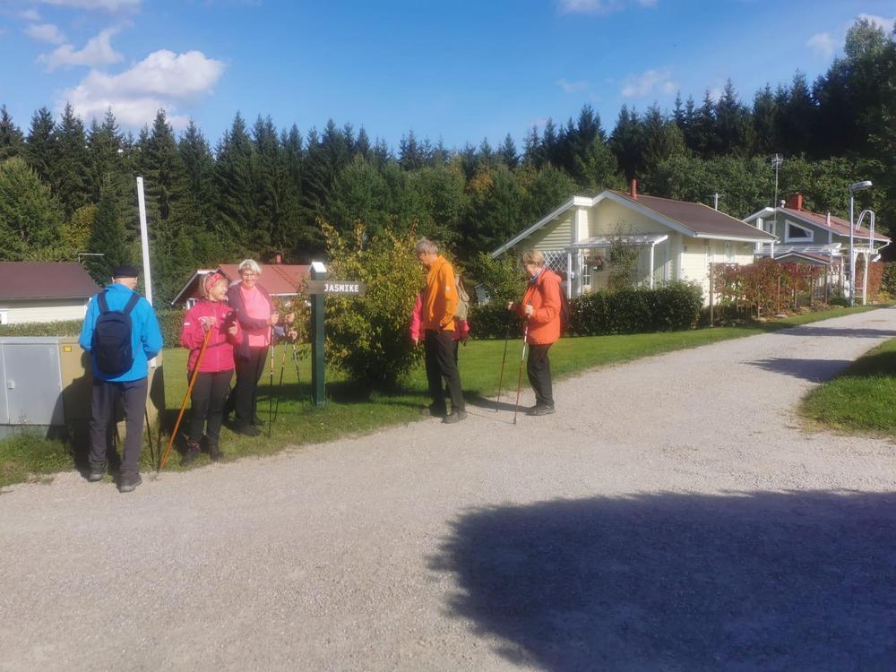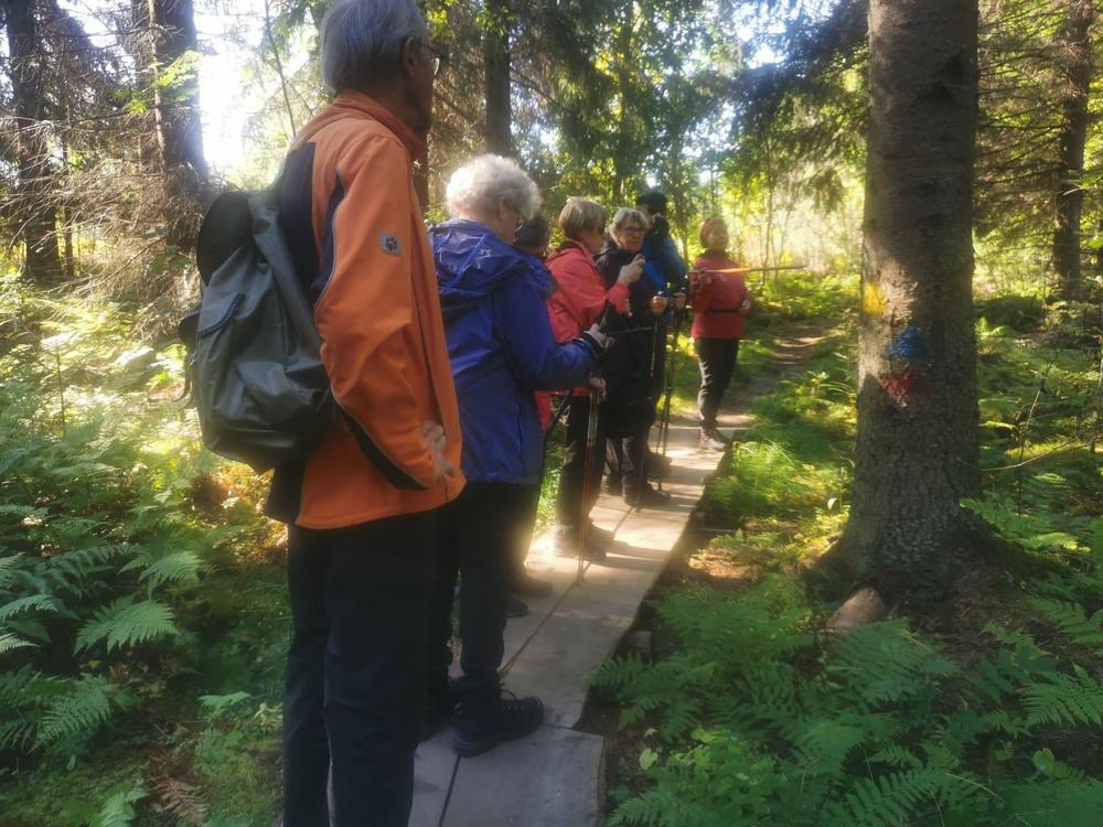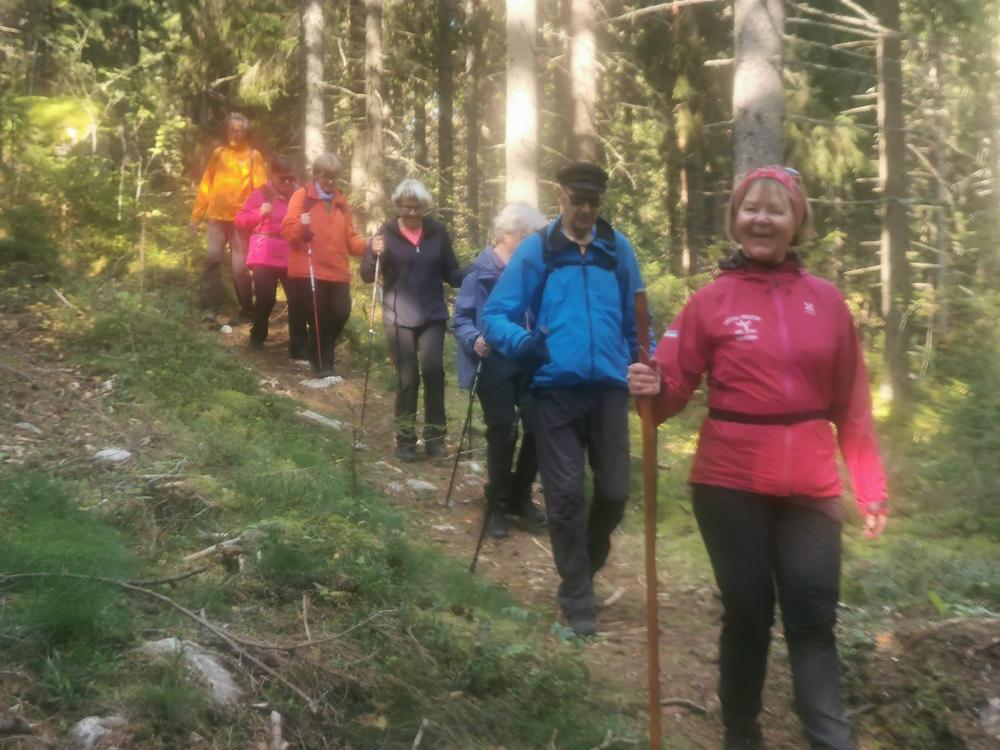 Tervehdys kivalta retkeltä. Meitä oli 20. Lyhyemmän retken Irman ja Kaijan kera Vuohimäen maastossa kiersi kahdeksan. Pidemmän reitin Soininmäen ympäri vaelsi Anne ja Jukka Pyykösen opastamina 12. Mitä mainioin sää ja metsän läpi siivilöityvä aurinko hurmasivat. Metsä ei ollut hiljainen vaan täyttyi iloisesti rupattelevista patikoijista. Ensi kerralla 3.10 menemme Kupolan poluille Tolvanniemeen.