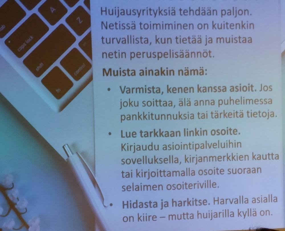 Tapaaminen jatkui Kuluttajaliiton Jaana Savolaisen luennolla siitä, miten meitä huijataan ja kuinka uhriksi voi joutua ihan kuka tahansa. Huijari voi olla liikkeellä esiintyen kaikilla mahdollisilla kanavilla. Näitä voi olla tekstiviestein, sähköpostissa tai myös puhelimessa. Muista ainakin tämä: