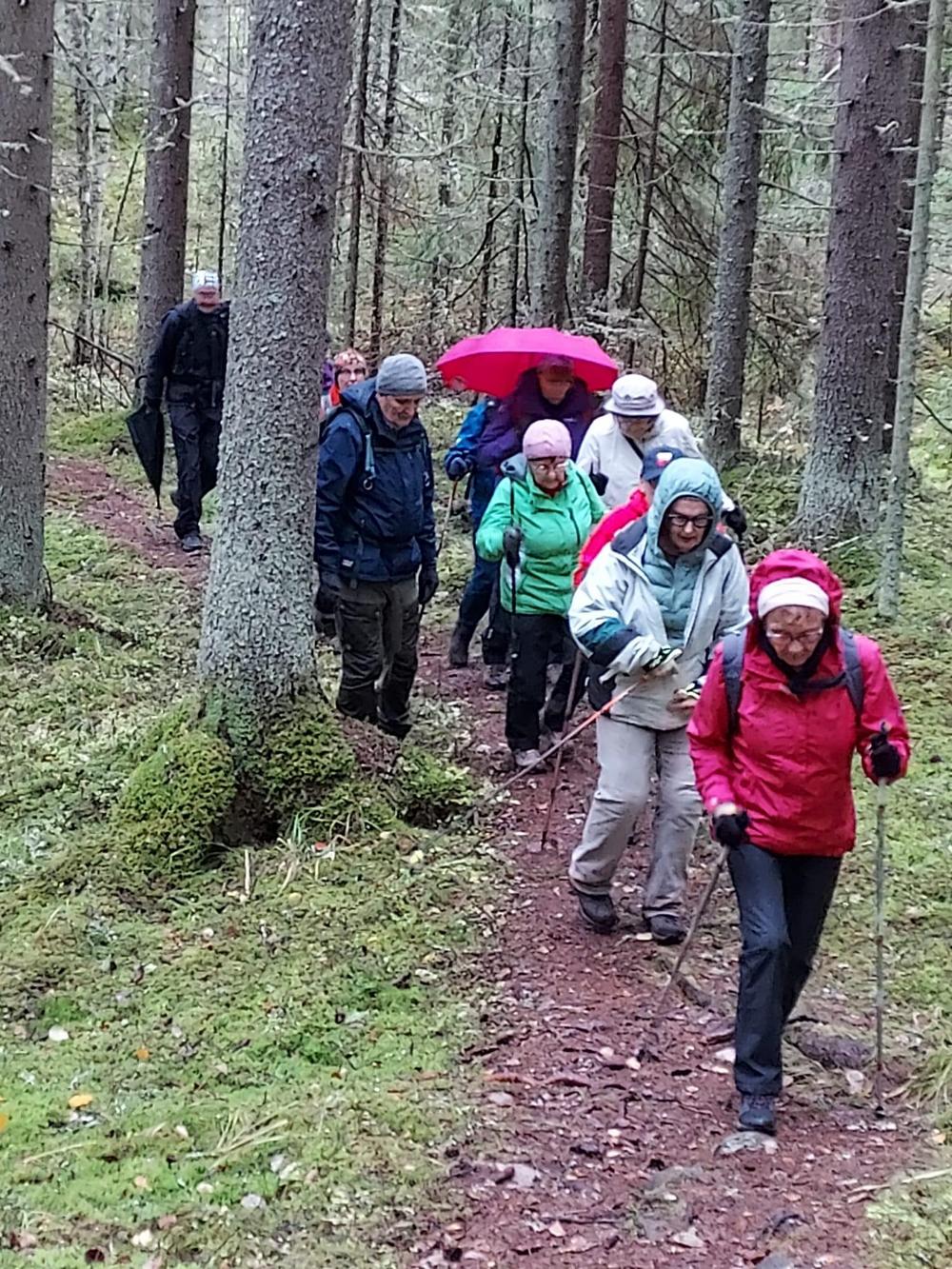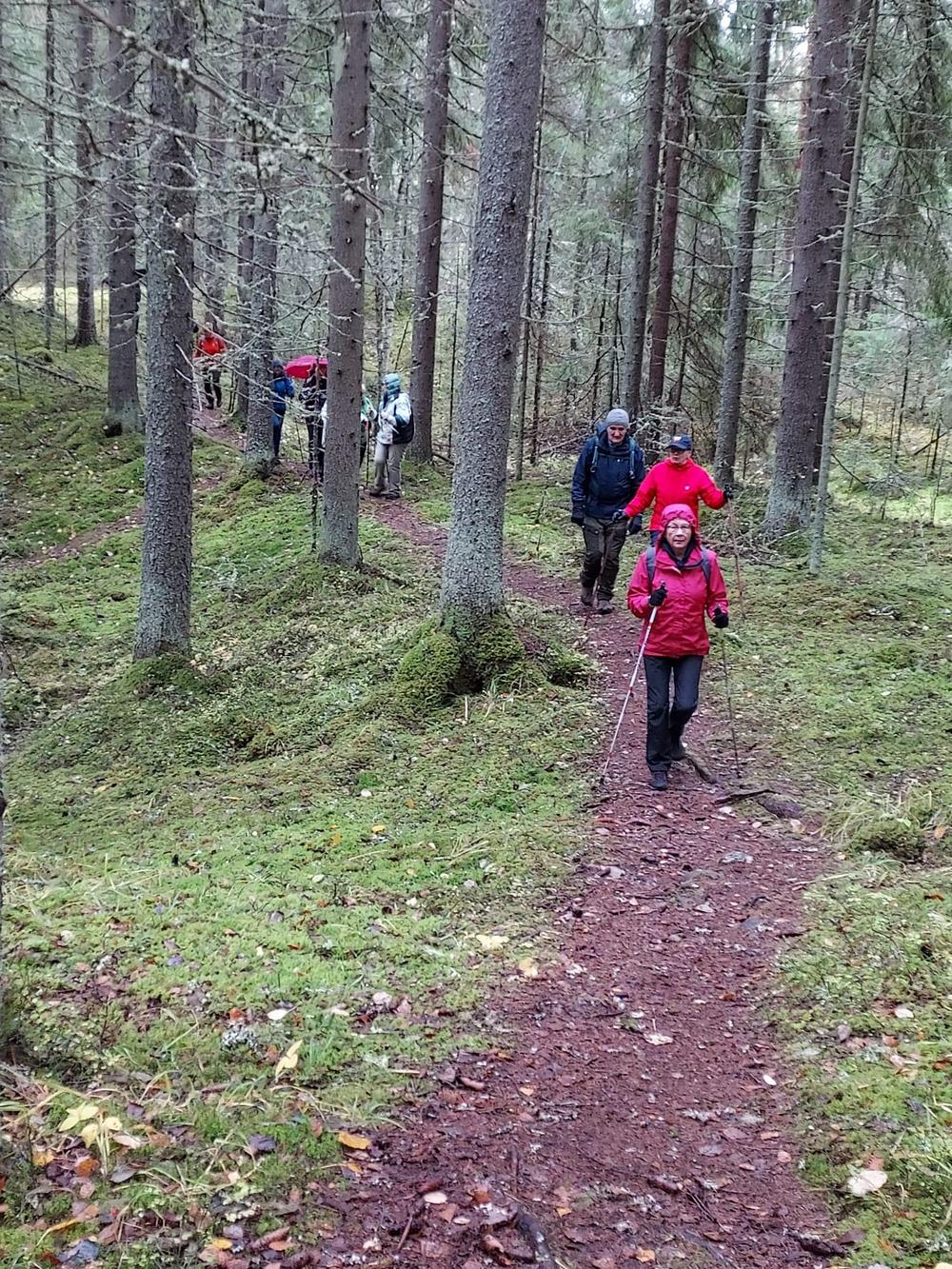 Maanantaina 14.10 oli Kulennoisharjun vaellus. Meitä patikkaopastajia ilahdutti kovasti, kun 12 pelotonta uhmasi tihkusateista säätä. Korkealla harjulla kulkeva ja vanhaan metsään poikkeava polku oli syksyisen kaunis. Annen ja Jukan johdattama reitti oli monelle uusi ja mielenkiintoinen.