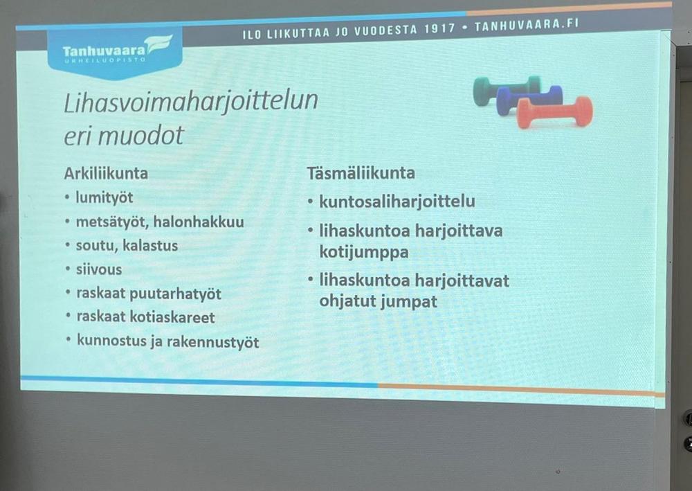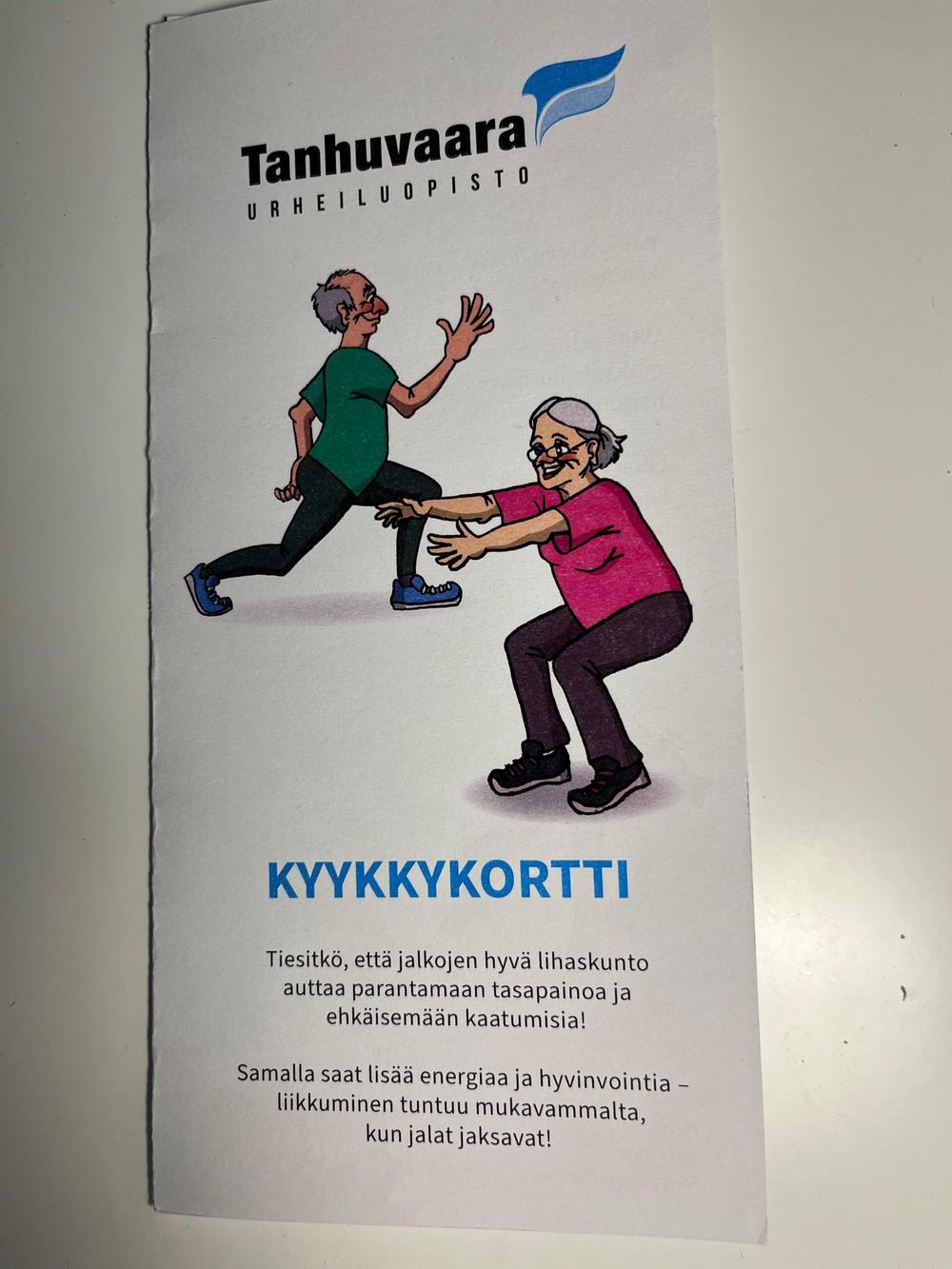 Erkonkulman viikkotapaamisessa 3.2. tietoiskun lihaskunnon ja liikunnan tärkeydestä välitti Tanhuvaaran urheiluopiston hyvinvointipäällikkö Sami Piisilä. Yli 65-vuotiaiden terveyssuosituksissa painotetaan lihasvoiman ja tasapainon kehittämistä, joita suositusten mukaan tulisi harjoittaa vähintään kaksi kertaa viikossa. Sami kutsui meidät jokaisen mukaan erityisesti ikäihmisille kohdennettuun Koivet Kuntoon-haasteeseen kohentamaan fyysistä toimintakykyä. Kampanjaan kuuluu myös "Kyykkykortti", mihin kirjataan päivittäin tehdyt kyykkyliikkeet 3 kk ajan.Osallistujia oli 30.