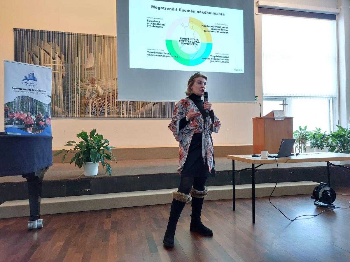 Kuukausitapaamiseemme saimme upean vieraan, YTT, dos. Elli Aaltosen, joka toimii Suomen Punaisen Ristin puheenjohtajana. Elli piti erinomaisen ja ajatuksia herättävän luennon aiheesta “Ikääntyminen ja hyvinvointi”. Hän tarkasteli ikääntymistä sosiaaliturvan etuuksien, eläketurvan sekä sote-palvelujen näkökulmista – selkeästi, asiantuntevasti ja erittäin monipuolisesti. Keskustelu herätti paljon ajatuksia. Samalla juhlistimme yhdistyksemme saamaa Vuoden senioriyhdistys 2025-palkintoa kakkukahvien kanssa.