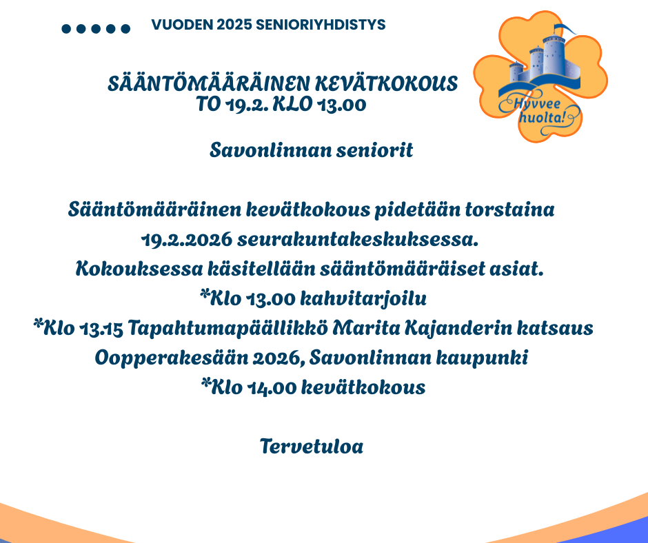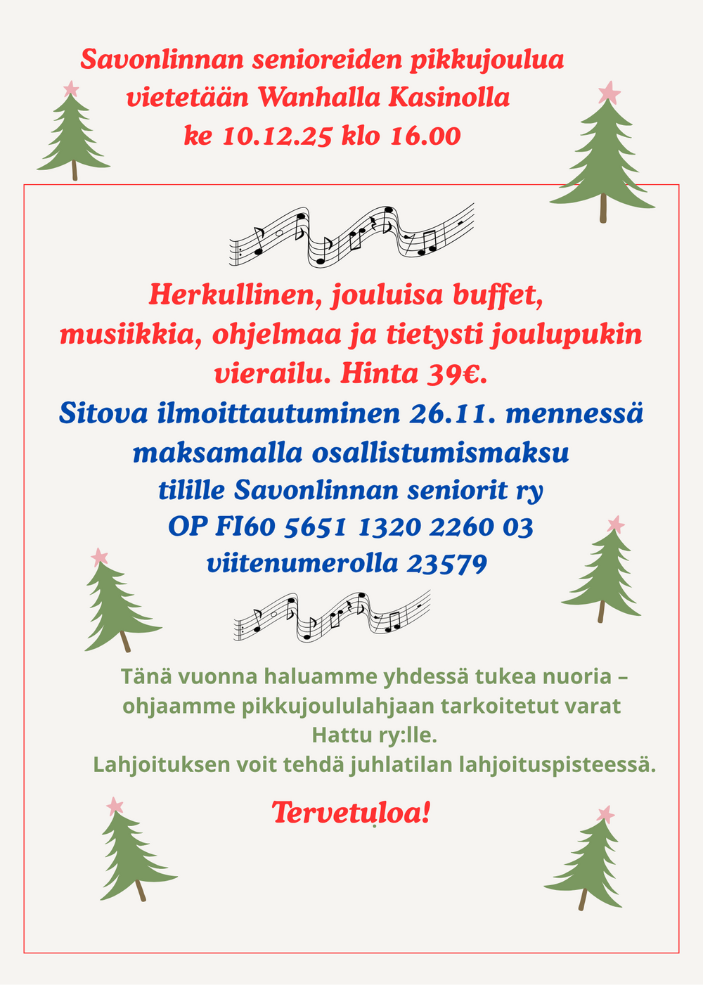 Olemme varanneet 20 lippua Jyrki Anttilan 60 v -juhlakonserttiin torstaina 12.3.2026 klo 18.00 Kulttuurikellarissa. Pääsylippu on 31,50 €. Tee varaus SenioriAppin kautta 3.3. mennessä. Varauksen voit tehdä myös Tiinalle, p. 040 015 2129. Yhdistyksemme lähettää sinulle laskun. Tervetuloa!